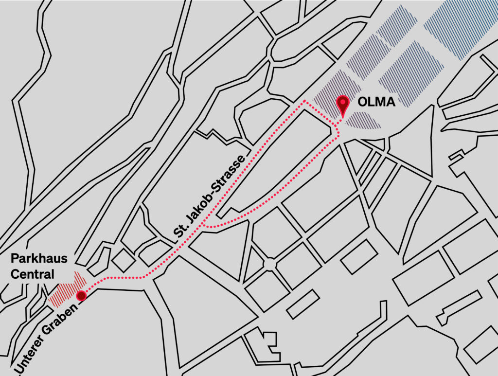 Vom Parkhaus Central aus gehen Sie rund 10 Minuten zu Fuss am Areal der Brauerei Schützengarten vorbei. So erreichen Sie den Haupteingang der Olma ohne Umwege.